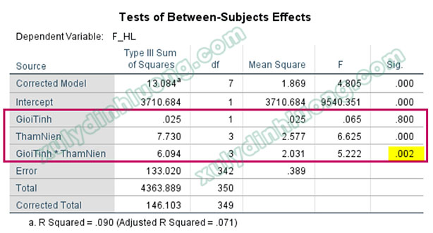 Bảng quan trọng nhất trong phân tích Two-way ANOVA là bảng Tests of Between-Subjects Effects. Giá trị sig tại ba dòng GioiTinh, ThamNien và GioiTinhThamNien cho biết liệu có sự khác biệt có ý nghĩa thống kê về giá trị trung bình của biến F_HL theo từng biến định tính và theo sự kết hợp giữa các biến đó hay không. Trong đó, giá trị sig tại dòng tương tác GioiTinhThamNien có ý nghĩa đặc biệt quan trọng vì phản ánh ảnh hưởng đồng thời của hai biến GioiTinh và ThamNien lên F_HL.